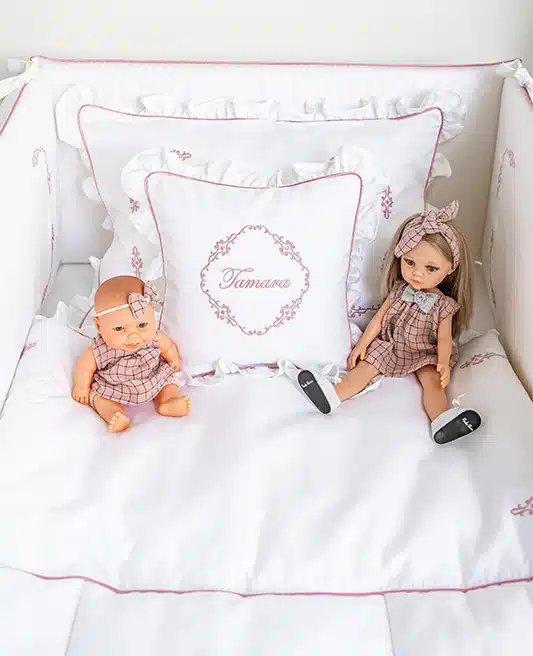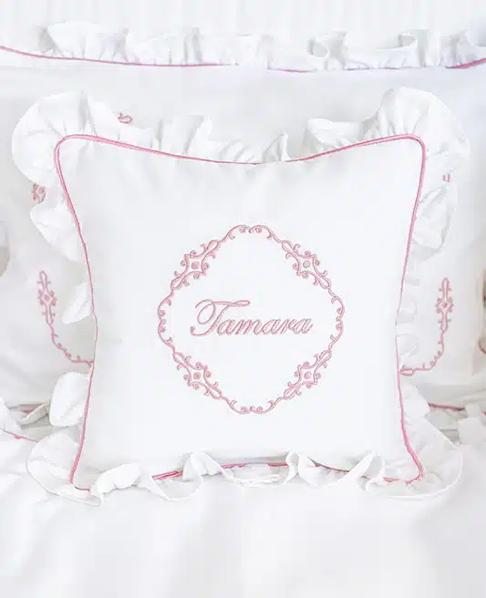 The “Lullaby Charm” Customizable Baby Pillow is an exquisite addition to your baby’s nursery, combining softness and a personal touch. This 25×25 cm pillow is edged with a gentle ruffle and accented by an antique pink stripe, setting the stage for the customizable embroidery that beautifully frames your baby’s name.