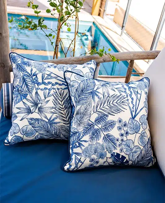 Presenting the ‘Blue Foliage Elegance Cushion Set’, a delightful pair of outdoor cushions that bring a harmonious blend of nature and style to your outdoor living spaces. Each cushion in this duo features a pure white base gracefully adorned with intricate blue flowers, creating an air of calm and elegance. The deep blue trim on both cushions perfectly matches the floral design, unifying the set with a sophisticated touch. Ideal for couples or coordinated seating areas, these cushions are perfect for adding a synchronized and stylish look to any garden, patio, or poolside setting. Their beauty lies in the symmetry and complementing patterns, making them not just functional but also a visually appealing addition to your outdoor decor.