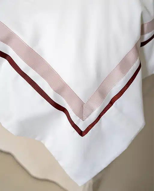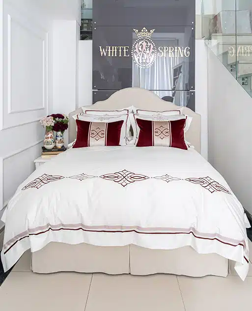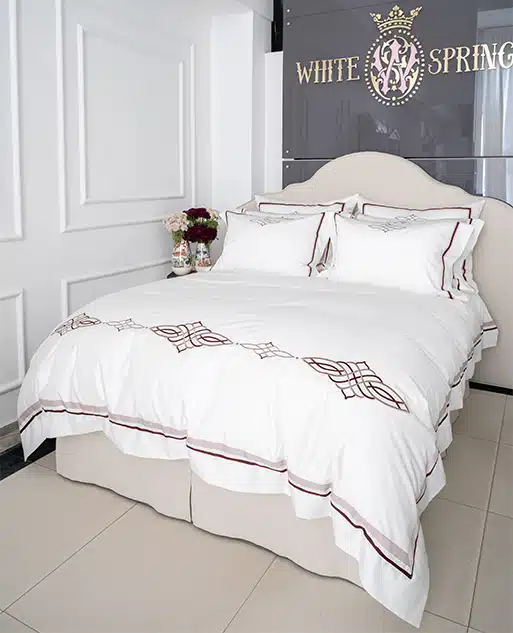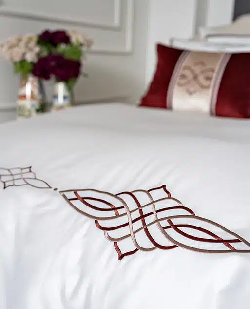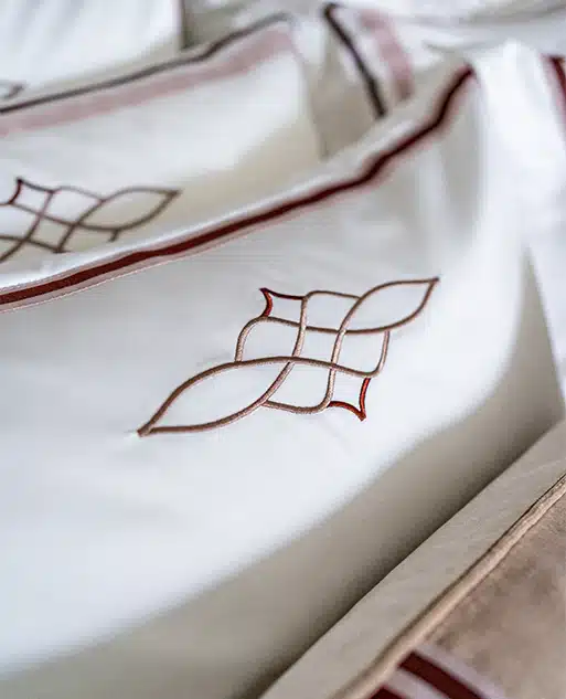 The design is defined by a distinctive geometric embroidery, combining deep burgundy and warm neutral tones. Every detail is thoughtfully balanced — from the placement of the embroidery to the layered borders that frame the bed with precision.