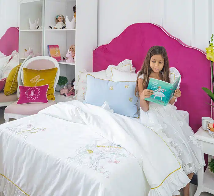 The fine contrast piping frames the shape and adds a refined detail, while the airy fabric brings a fresh, effortless feel to the bed.