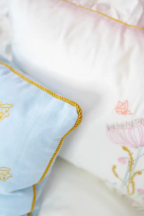 A light decorative cushion crafted from a linen-cotton blend in a soft sky blue tone, featuring delicate butterfly embroidery placed subtly along the side.
