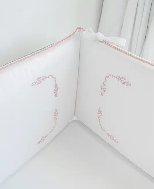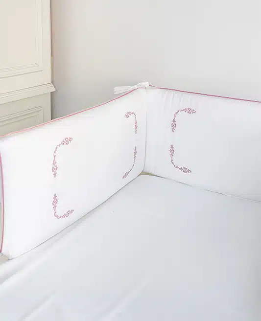 The bumper attaches securely to the crib with ties, ensuring safety and stability. Standard sets cover half the crib for targeted protection, with an option to order a full-surround version for all-around safety by selecting the full-size dimensions. This feature ensures adaptability and convenience for parents, maintaining the “Vintage Blush” Crib Bumper’s beauty and practicality.