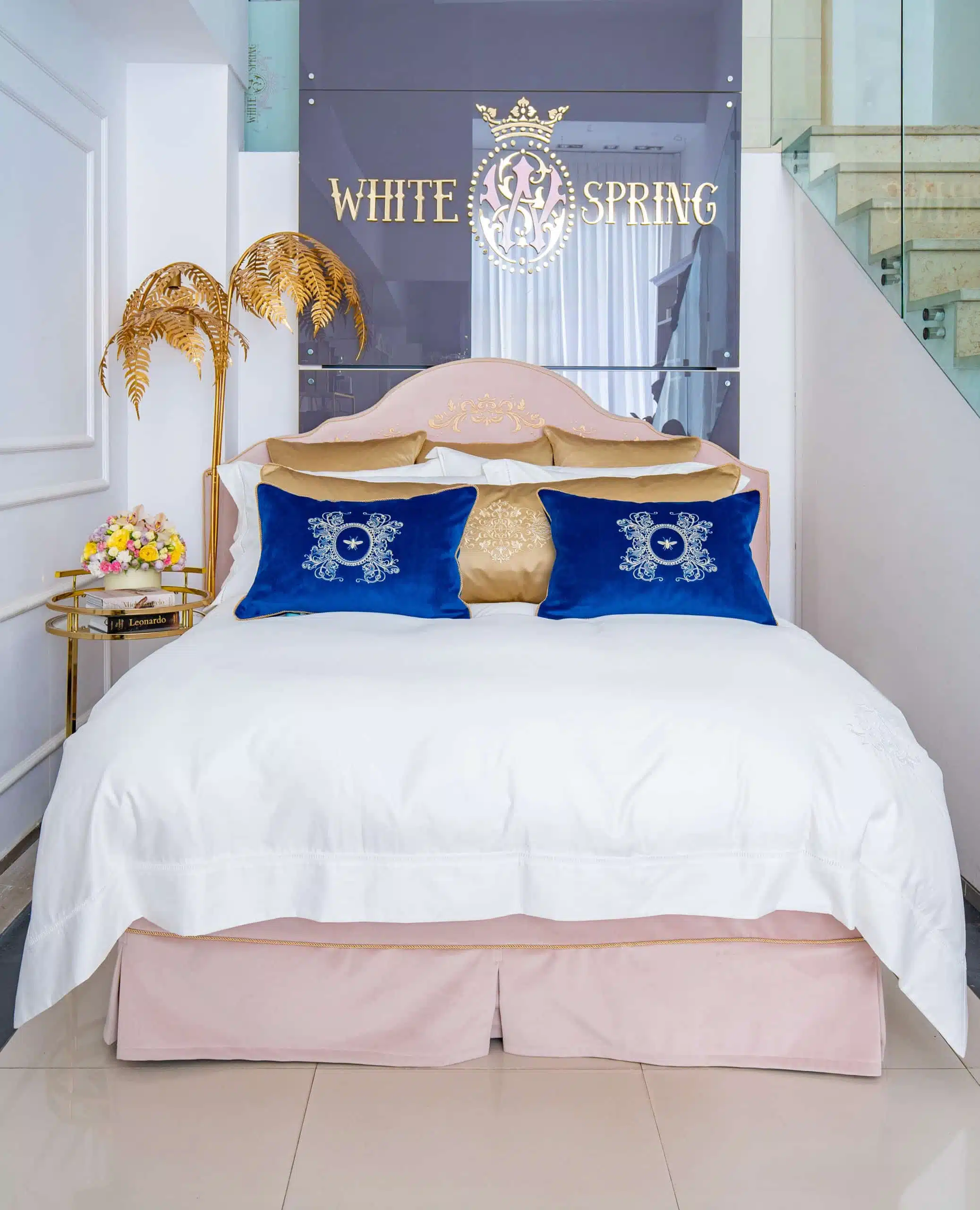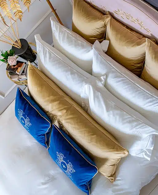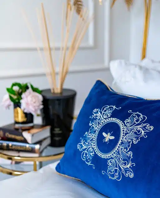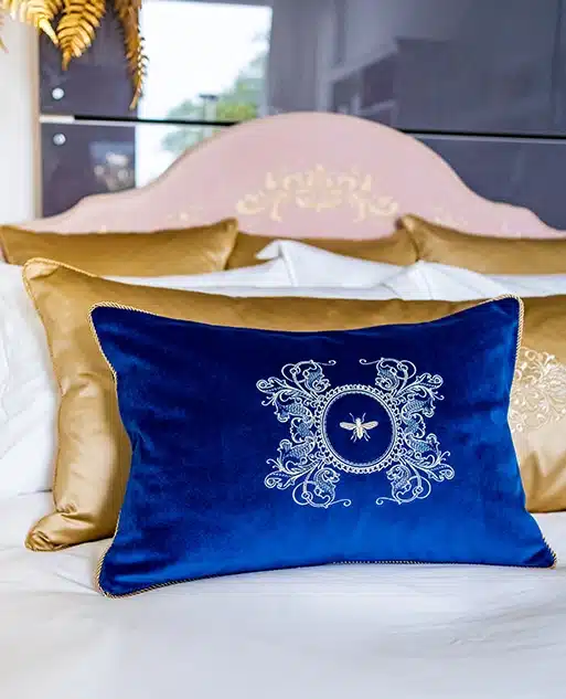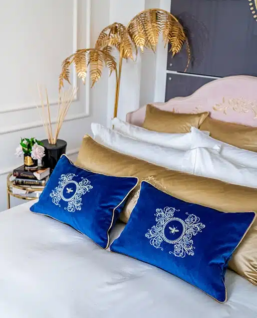 This pillow became a “must have” item and the ultimate decorative choice for every fashionista’s bedroom or livingroom. The timeless “Velvet Blue Royal” coupled with a reach gold embroidery detail had made it as a classic piece, elegant but modern. The pillow is surrounded by a delicate braided gold trim.
