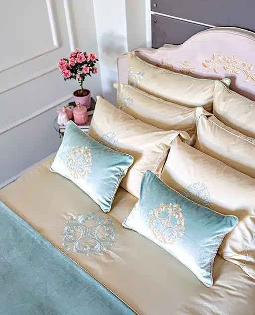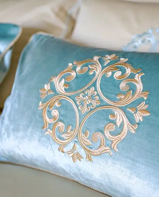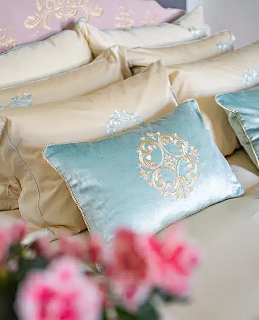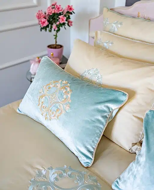 This fashionable velvet cushion is entirely hand-embroidered with a beautiful embroidery . Trimmed with a champagne braid all around. Position it on your bed to get some royal heritage.
