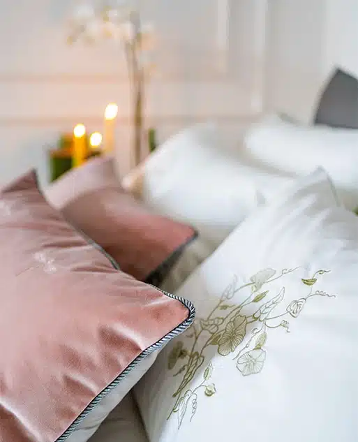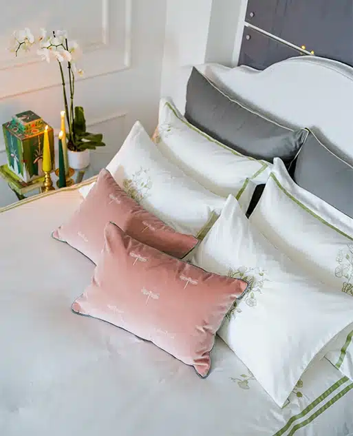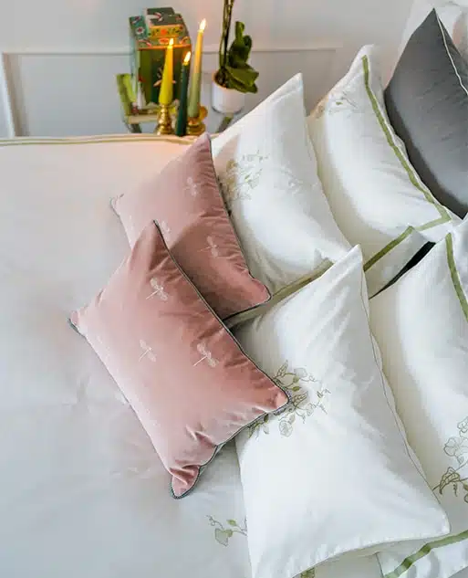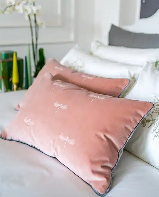 This fashionable velvet cushion is entirely hand-embroidered with a beautiful dragonfly embroidery . Trimmed with a grey braid all around.