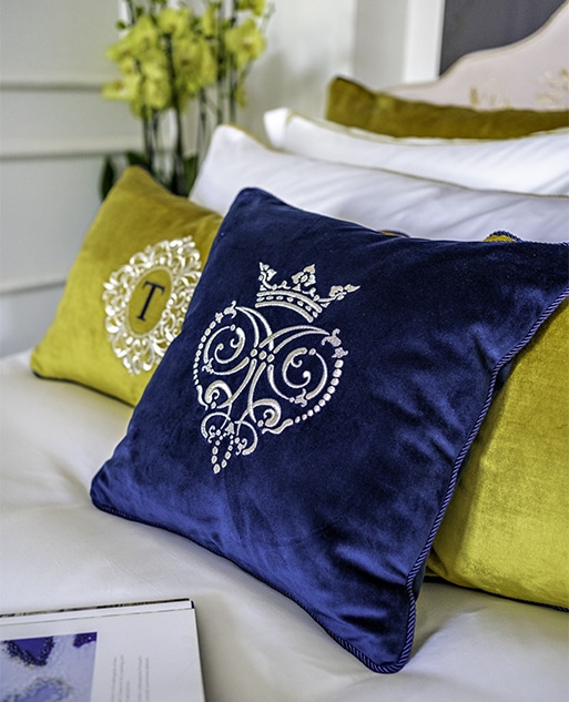 This blue velvet cushion refers to the house’s passion for elegant-inspired prints. This home accessory is crafted from luxurious velvet and trimmed with gentle blue braided. Position it on a bed to bring royalty to your bedroom.