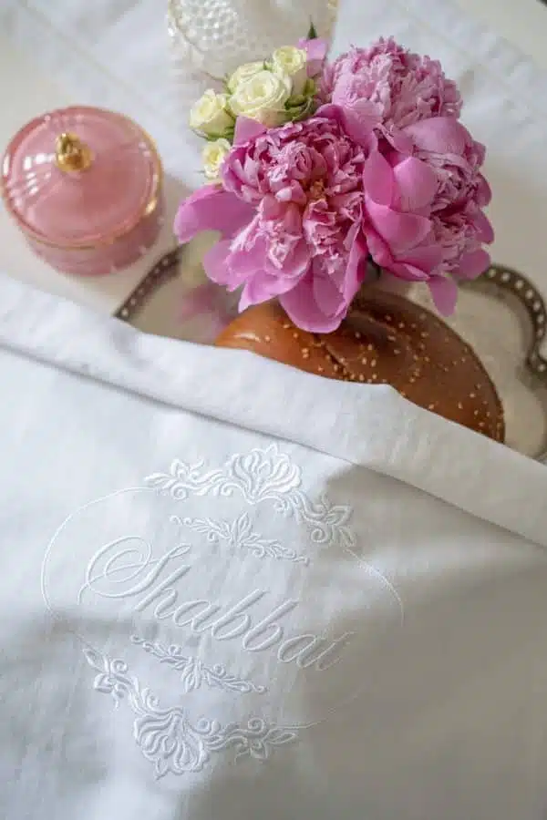 100% White Linen “Shabbat” for a Challah [bread] Cover. White “Shabbat” embroidery with delicate contour embroidery (White on White). It is possible to order silver embroidery or custom design with initials or family name. Amazing traditional gift for friends and family.