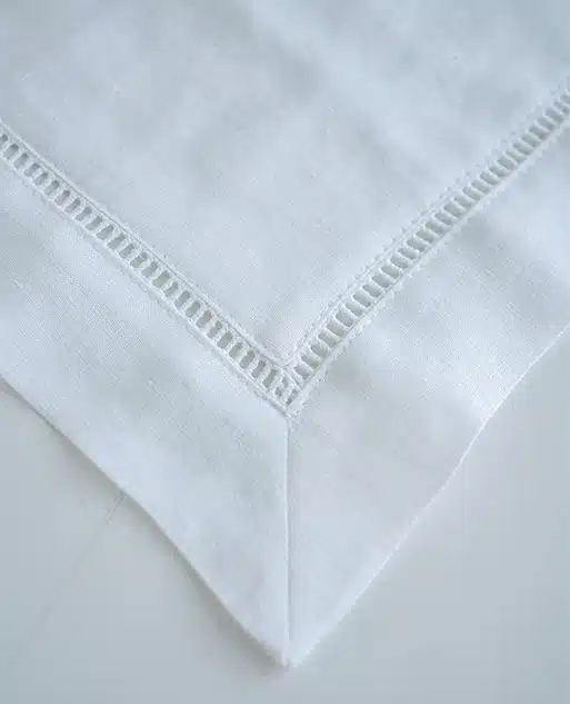 100% White Linen “Shabbat veYom Tov”  for a Challah [bread] Cover, featuring a hemistich border and white embroidery.