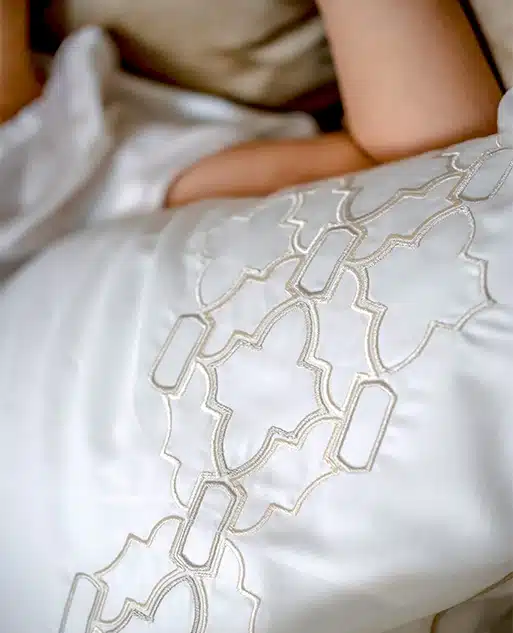Indulge in refined luxury with our Imperial Embroidery Duvet Cover, crafted from 100% cotton sateen with a 500-thread count for a sumptuously soft and silky feel. Designed for those who appreciate exquisite detailing and sophisticated craftsmanship, this duvet cover features a stunning embroidery pattern inspired by timeless architectural motifs.