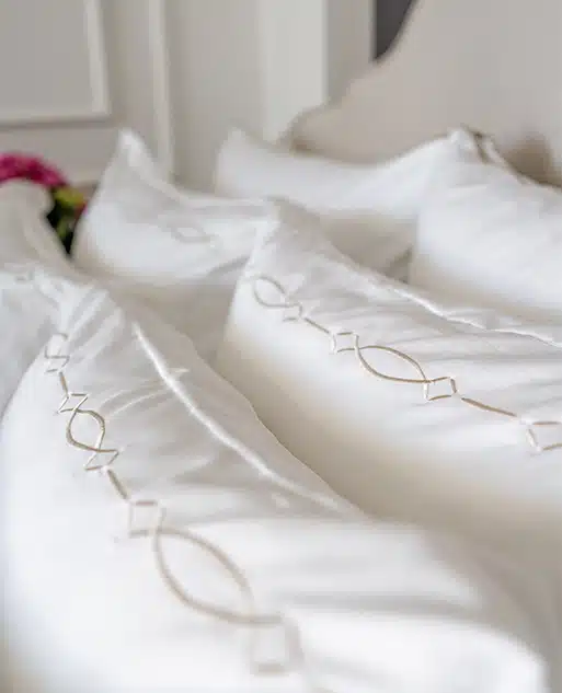 The defining detail is the continuous embroidered line, inspired by the symbol of infinity. Subtle and fluid, it adds movement and identity without overpowering the space.