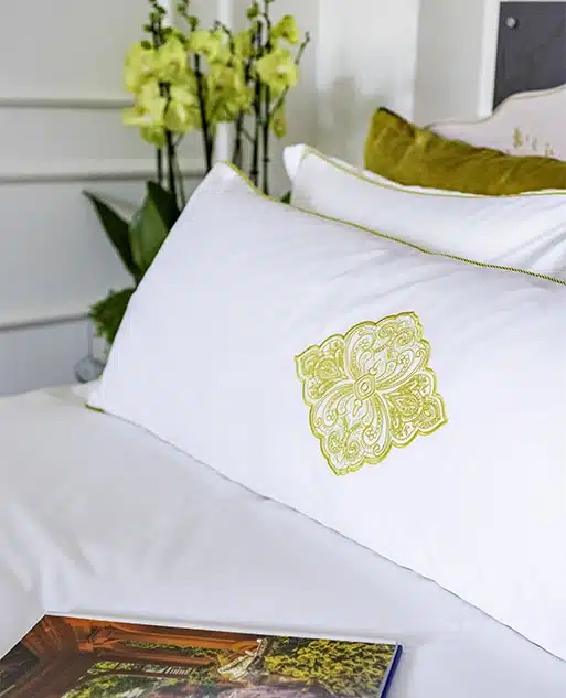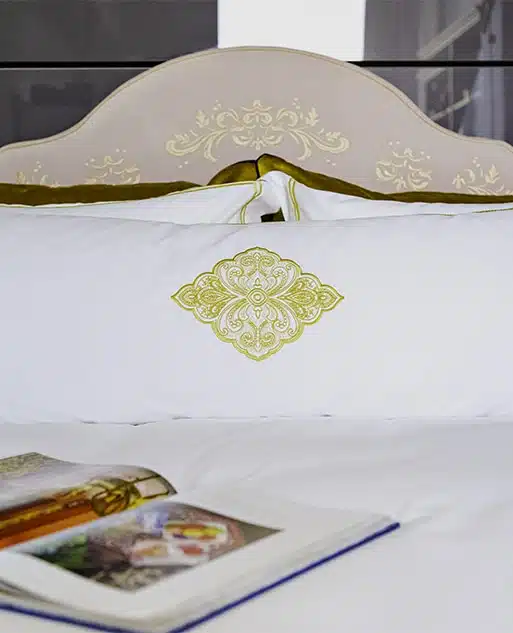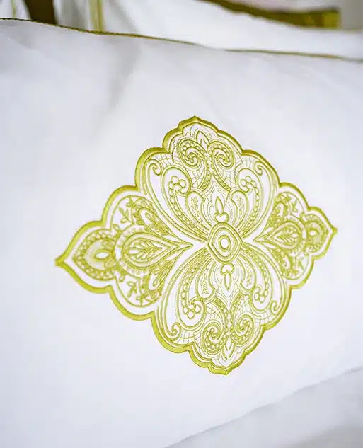 This “Damask” Embroidered Long Pillow is the ultimate additional decorative piece to complete your linen set. The Cover is removable and comes with the filling pillow (100% feathers).