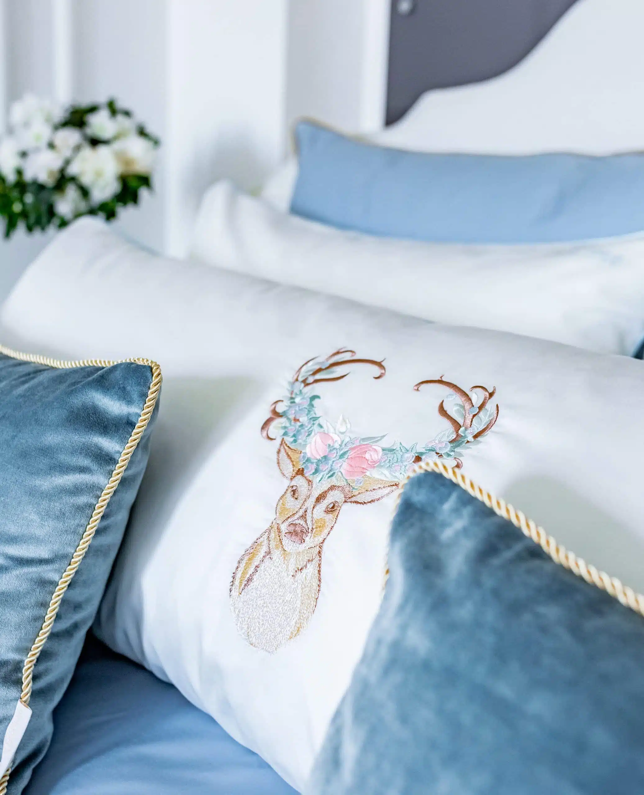 This “Deer and colourful flowers” Embroidered Long Pillow is the ultimate additional decorative piece to complete your linen set. A mix of pink, purple and white flowers are adorning the Deer’ horns that are indicating brown branches. The Cover is removable and comes with the filling pillow (100% feathers).