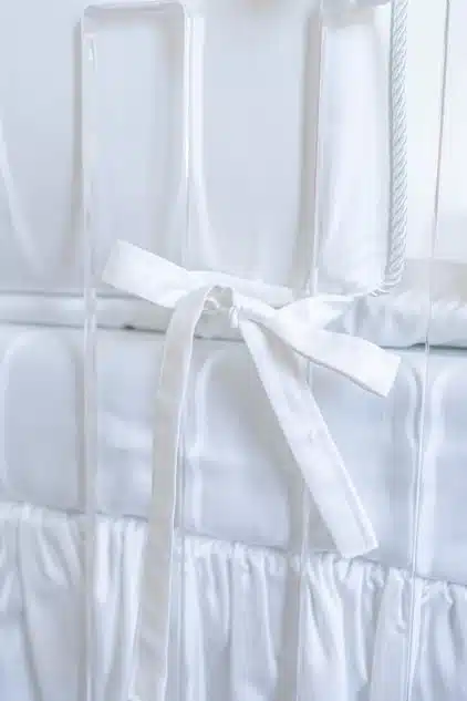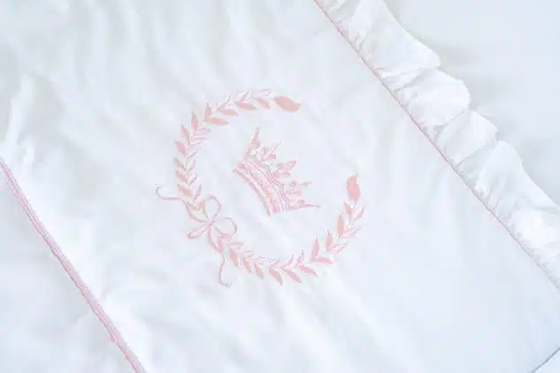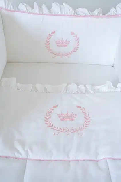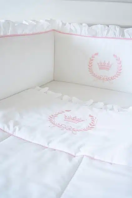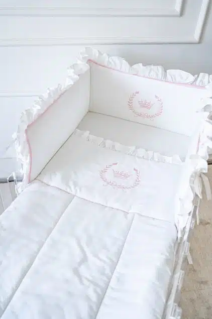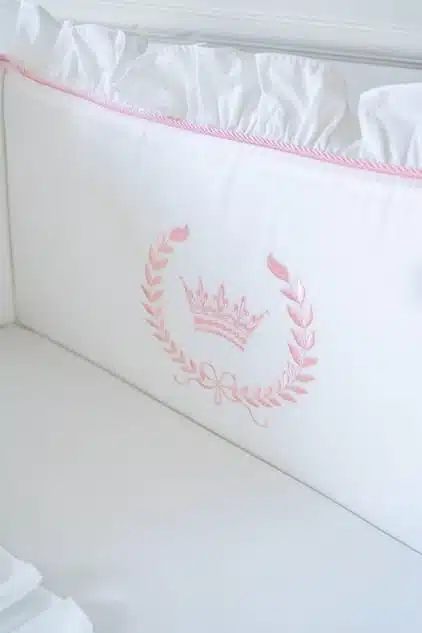 This three-set item includes a luxurious bottom sheet, mini embroidered duvet and a Crib bumper pad with a delicate embroidery detail. The Crown isĀ  icon of timeless and elegant. The ultimate gift for the new baby born.