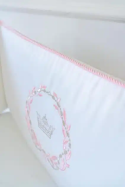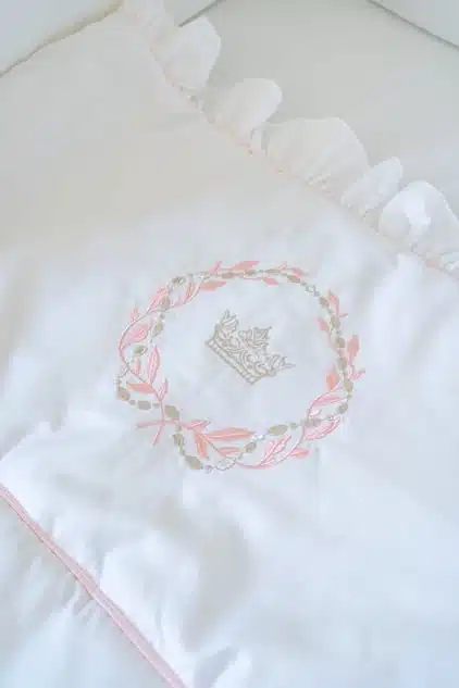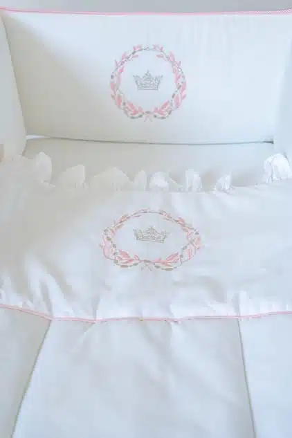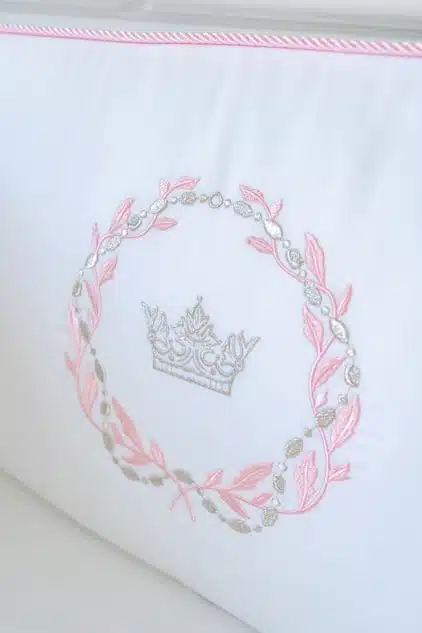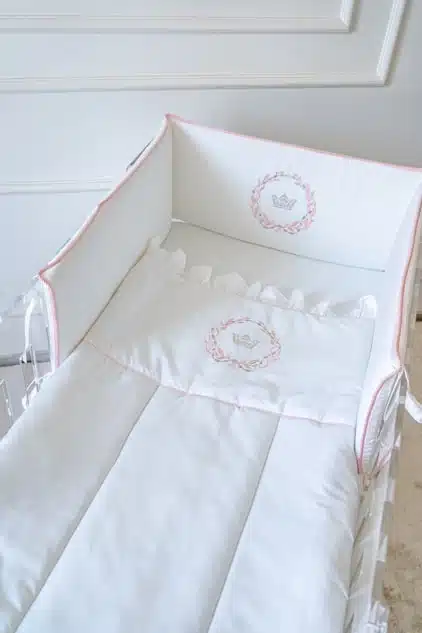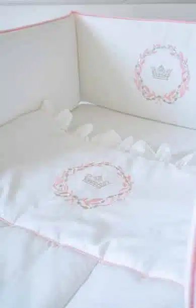 This three-set item includes a luxurious bottom sheet, mini embroidered duvet and a Crib bumper pad with a delicate embroidery detail. The Princess icon is timeless, elegant and girly. The ultimate gift for the new baby born.