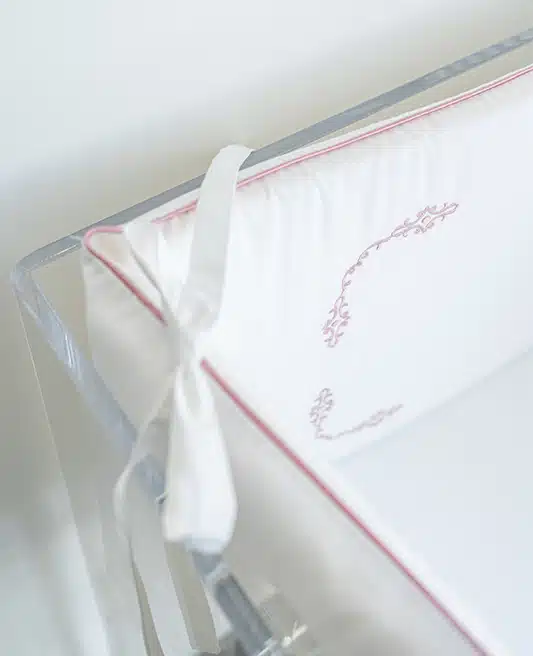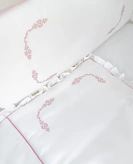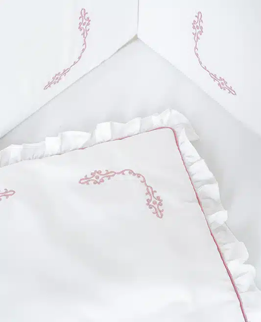 Embellishing the corners of the bumper and blanket are intricate embroideries in an antique pink hue, adding a touch of timeless beauty to the set. This subtle yet striking design is framed by a slender embroidery border, echoing the vintage pink motif for a cohesive and refined aesthetic. The “Vintage Blush” Baby Bedding Set is not only a testament to sophisticated nursery decor but also ensures a soft, serene sleeping environment for your baby.