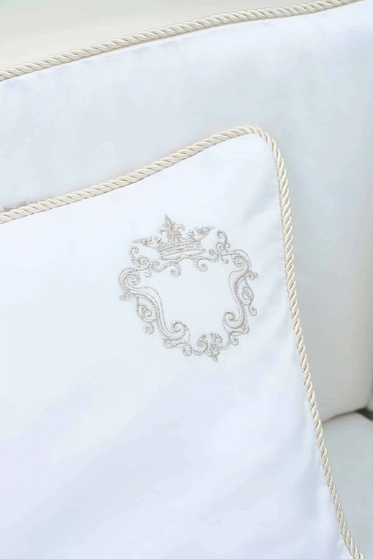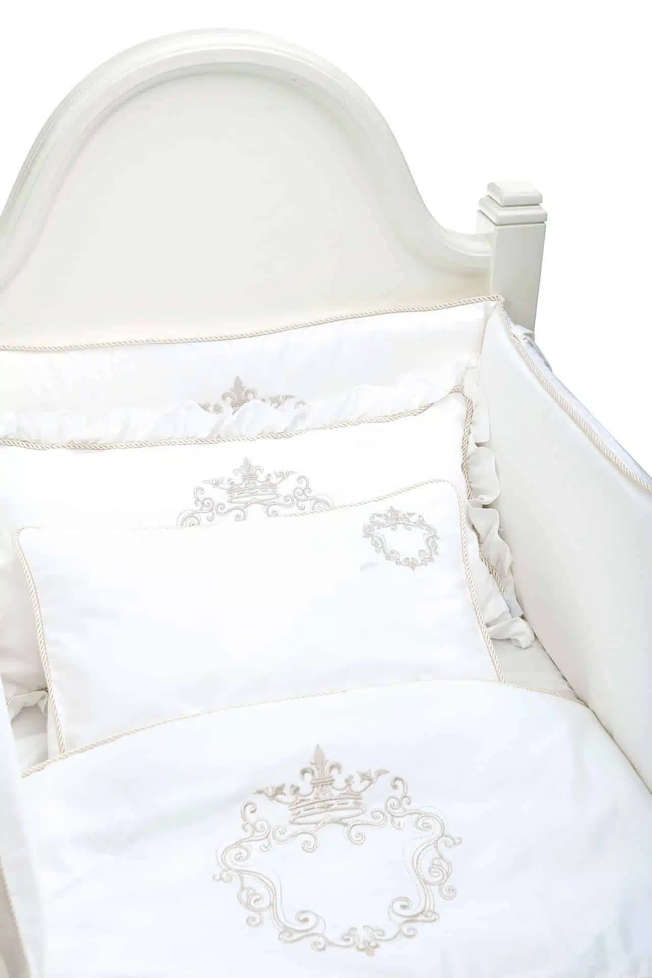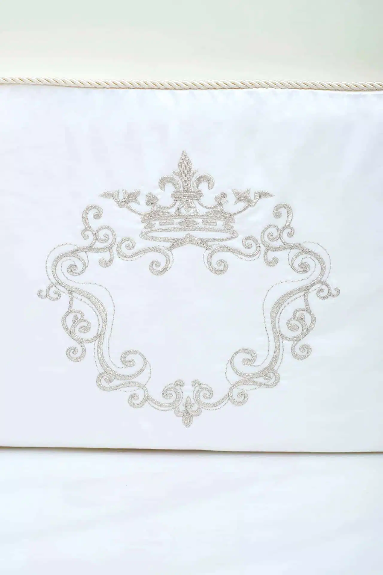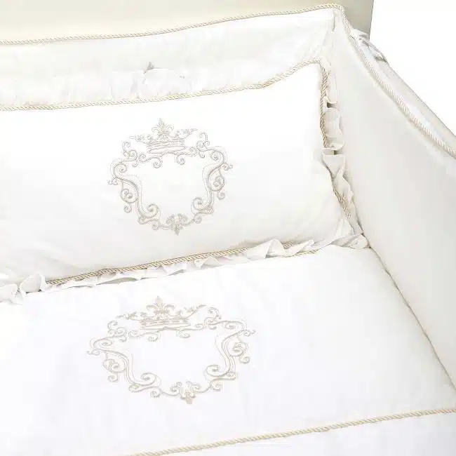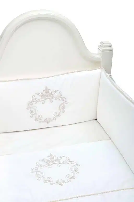This three- items set includes a luxurious bottom sheet, mini embroidered duvet and a Crib bumper pad with a delicate Silver embroidery detail. You are able to inquire your own initial and our design team will feature it inside the icon. This timeless, elegant and unisex 100% Egyptian cotton set is the ultimate gift for a new baby born.
