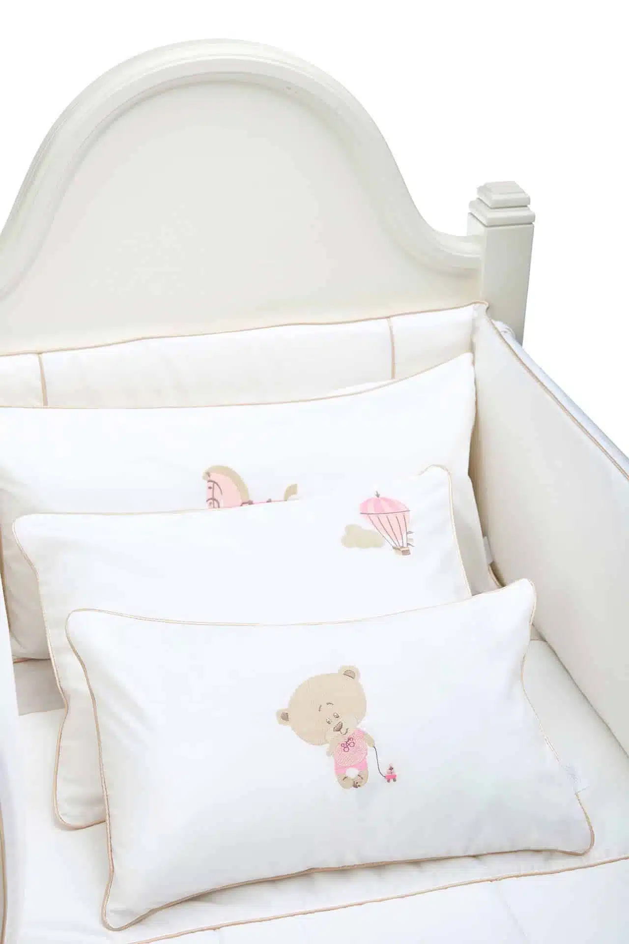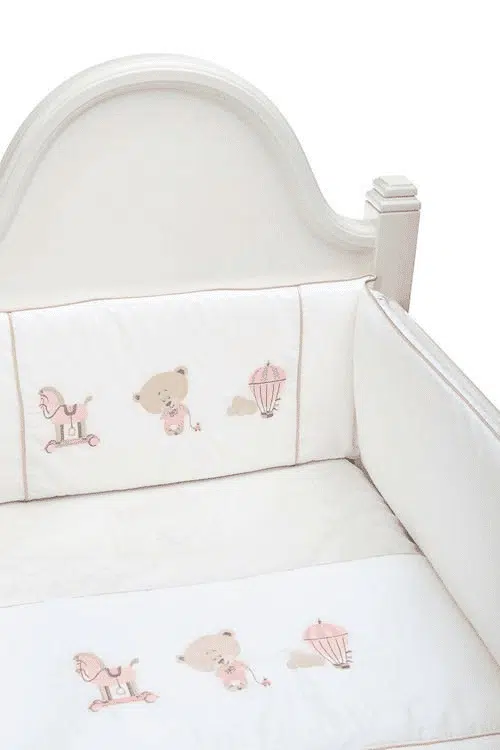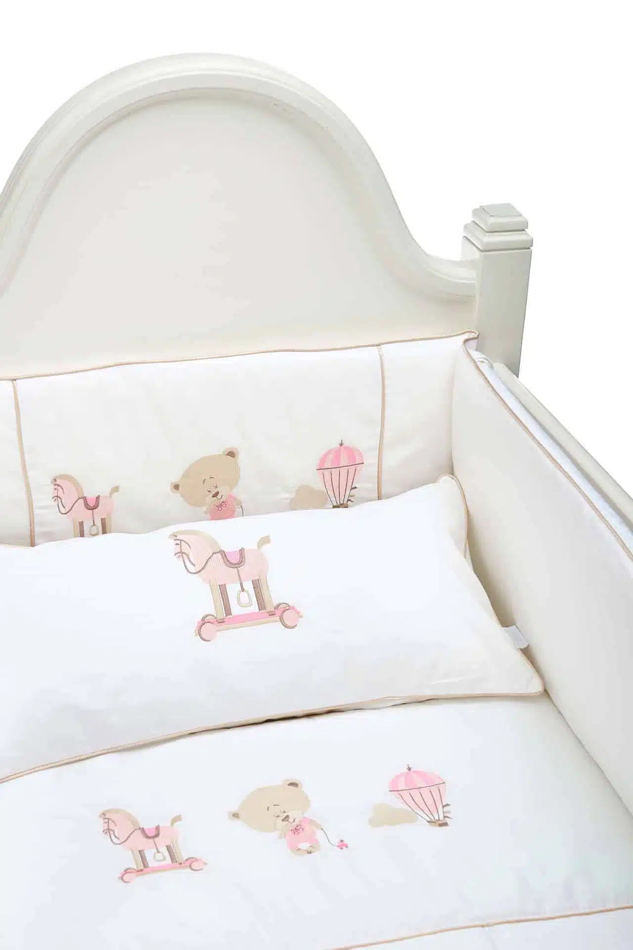 This three-item set includes a luxurious bottom sheet, mini embroidered duvet and a Crib bumper pad with a delicate embroidery detail of three timeless baby girl icons. This set is the perfect treat for your a new born.