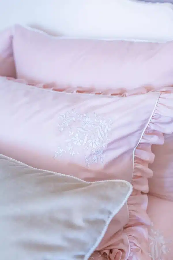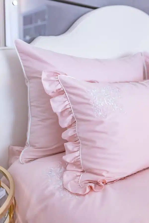 This elegant pink powder sheet-set, features a delicate white embroidery detail on both the duvet cover and on both pillow cases. Made out of soft Egyptian cotton sateen and the Duvet cover is trimmed with a gentle white braid and ruffles around the edges. This design complements every sophisticated interior.