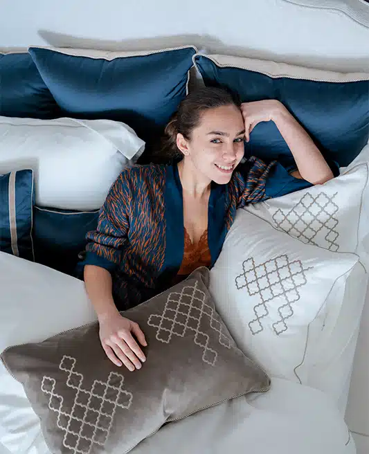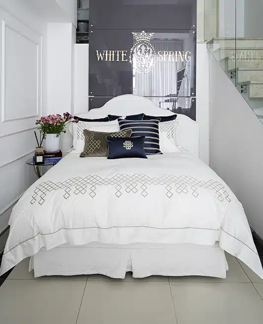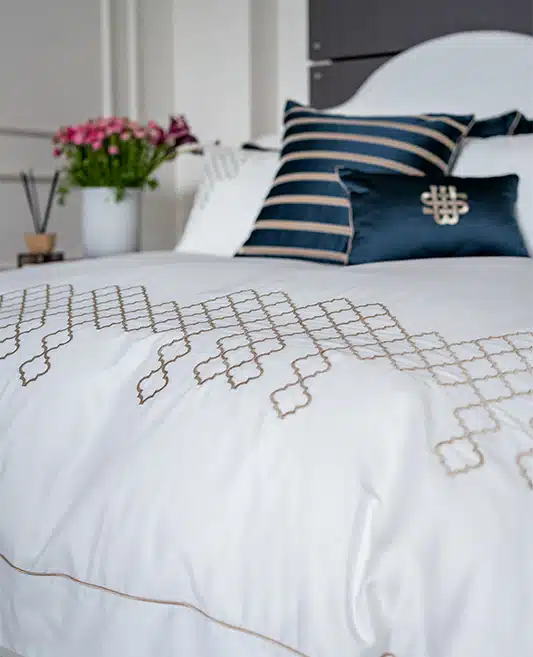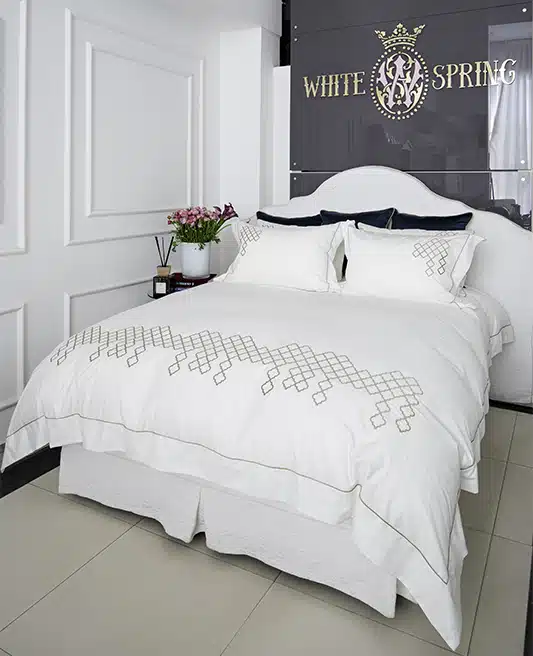 Introducing the “Elegant Diamond Oasis” Bedding Set, where timeless elegance meets unparalleled comfort. This set is a tribute to the luxury and meticulous craftsmanship that has defined the finest Egyptian cotton sateen linens. Each piece in the collection is a masterpiece, featuring a sophisticated white base elegantly embellished with diamond-shaped Damask embroidery. This unique design element, positioned prominently at the lower part of the duvet cover, spans its entire width and stands at an impressive height of 22 cm, showcasing the set’s exquisite attention to detail.