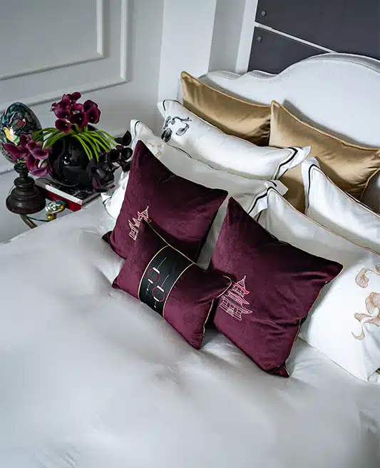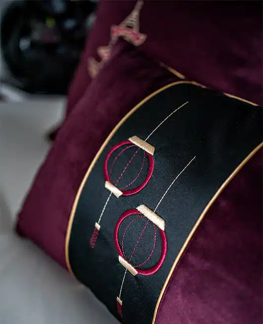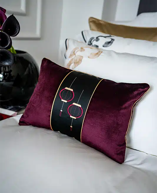 Introducing the “Mystic Lanterns Velvet Cushion,” a masterpiece of design that marries traditional Japanese aesthetics with contemporary elegance. This exquisite cushion features a plush bordeaux-plum velvet base, evoking a sense of warmth and luxury.