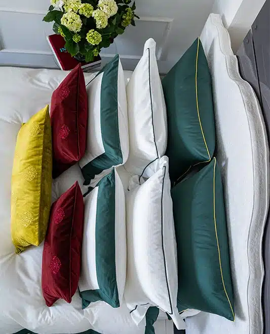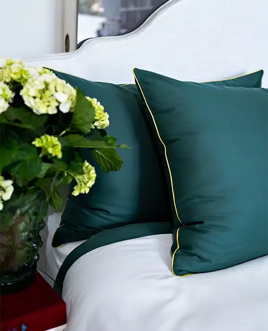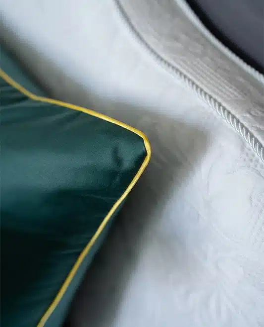The unique pillowcases feature a deep green hue and are accentuated with a thin mustard-yellow piping, adding a refined touch to your bedding ensemble. Designed for oversized, non-standard pillows, these pillowcases bring a bold, sophisticated aesthetic to your bedroom. They are available for purchase separately, allowing you to customize the perfect set to complement your style.