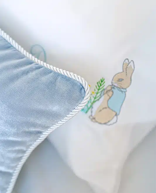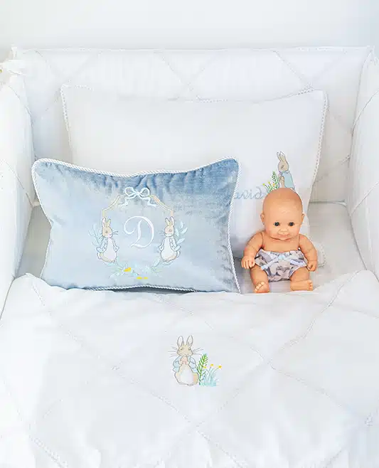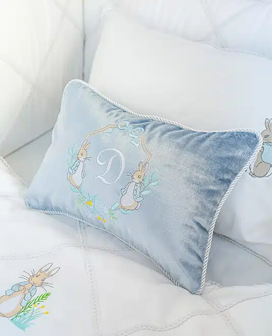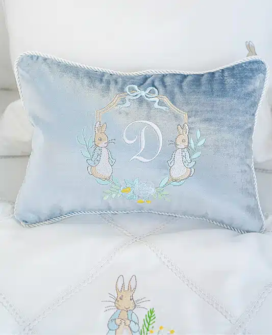Add a touch of luxury and whimsy to your baby’s nursery with our Personalized Peter Rabbit Velvet Pillow. Made from sumptuous, soft velvet, this elegant pillow features a beautifully embroidered monogram framed by two charming Peter Rabbit illustrations.