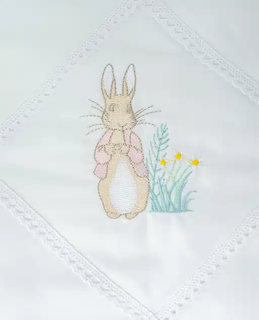 ✨ Charming Peter Rabbit Embroidery – Features a beautifully embroidered rabbit in soft pink tones for a sweet and timeless look.