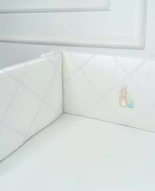 Crafted from 100% cotton sateen with a luxurious 500-thread count, this bumper combines comfort, safety, and timeless beauty. The delicate lace diamond pattern and pastel pink Peter Rabbit embroidery bring a touch of sweetness and sophistication to any nursery.
