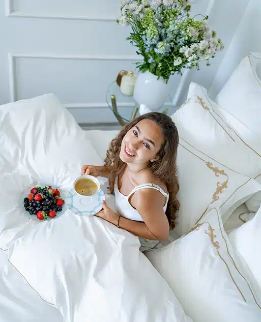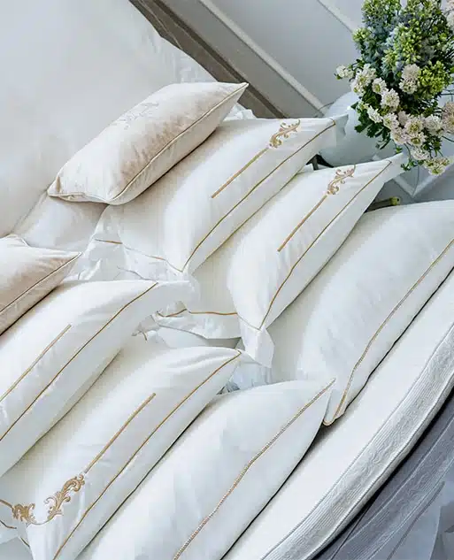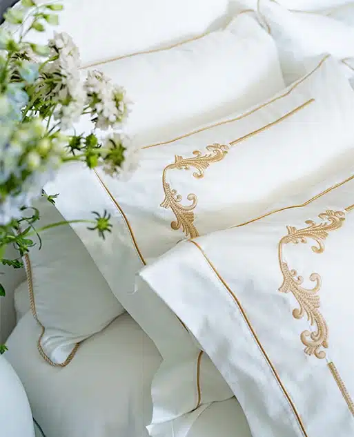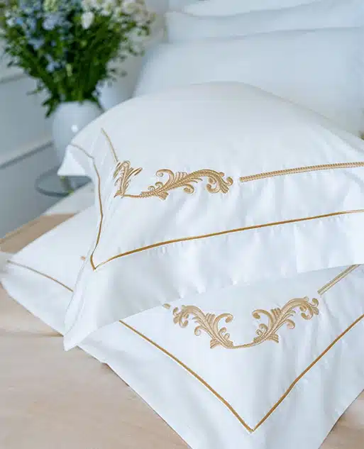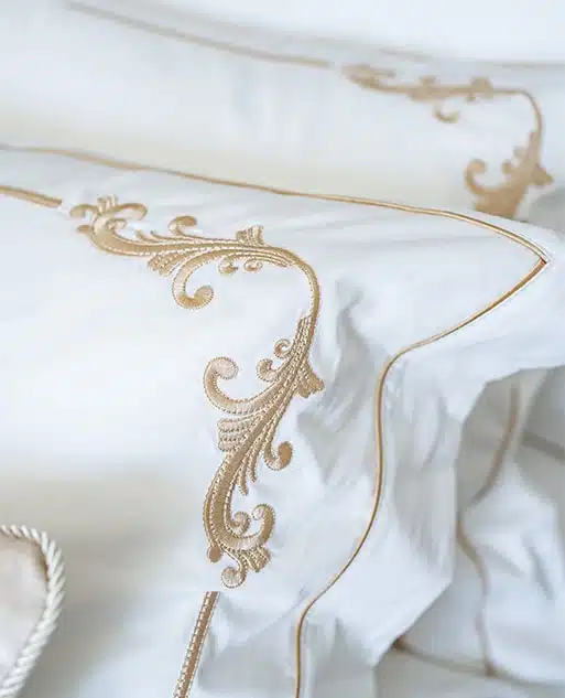 Indulge in luxury with the ‘Golden Embrace’ pillowcase. Its exquisite golden embroidery on a pristine white background exudes elegance and sophistication. Made from high-density Egyptian cotton satin, this pillowcase offers a silky-smooth touch and exceptional durability, providing an inviting layer of comfort to your bedding ensemble.