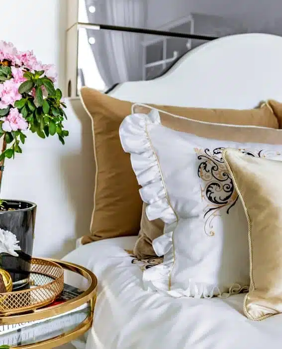 This elegant sheet set feature a soft Egyptian cotton sateen with a beautiful mustard and brown embroidery detail on the pillow cases. The Pillow Case is trimmed with a gentle cream braid and ruffles around the edges. This design complements every sophisticated interior.