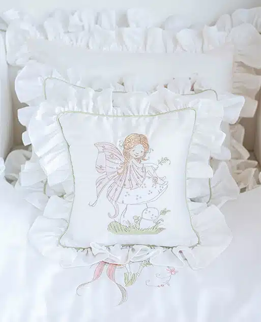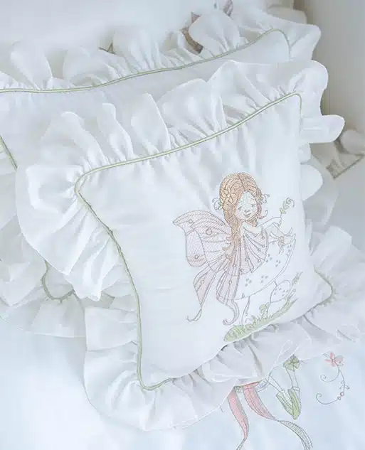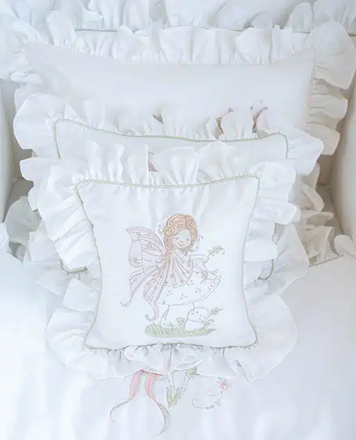 This Timeless Custom-Made “Dreamland” pillow is crafted from soft Egyptian cotton, features a pistachio braided trim and romantic ruffles which run around the edge. This decorative piece is suitable for every girls’ room: starting from an early age and up to sweet 16.