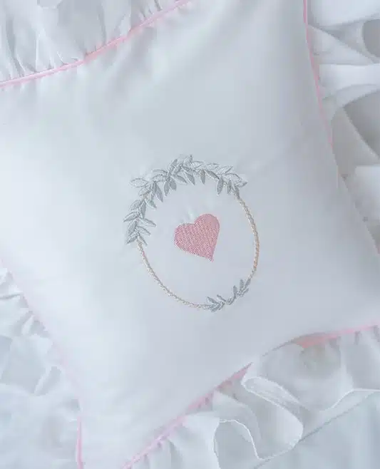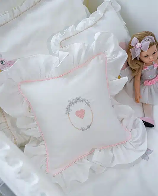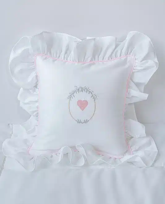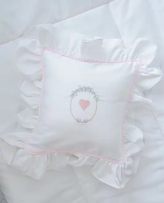 This Timeless Custom-Made “Pink Heart” pillow is crafted from soft Egyptian cotton, features a pink braided trim and romantic ruffles which run around the edge. This decorative piece is suitable for every girls’ room: starting from an early age and up to sweet 16.
