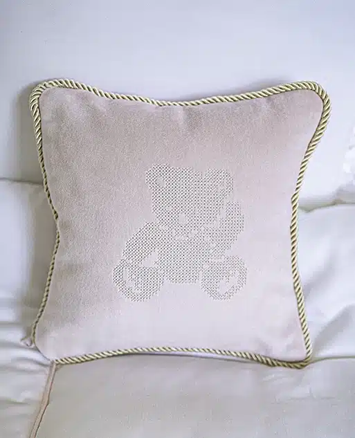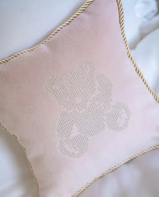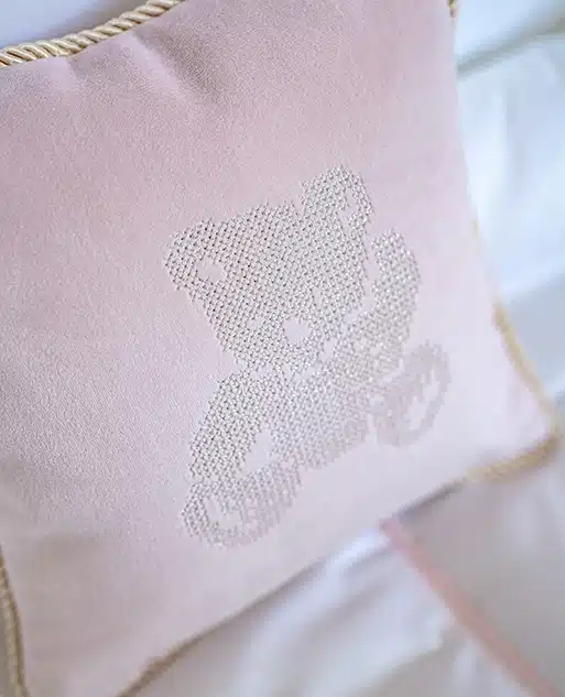 This little tiny light pink embroidered “Teddy Bear” velvet Pillow is the ultimate gift to complete a whole styling bed set. It will add to your baby’s crib a luxurious look thanks to its precise tint, the couture work and the delicate “champaign” trim braid around the edge. This filled square pillow has a zip at the back.