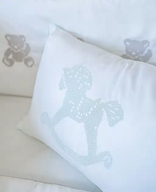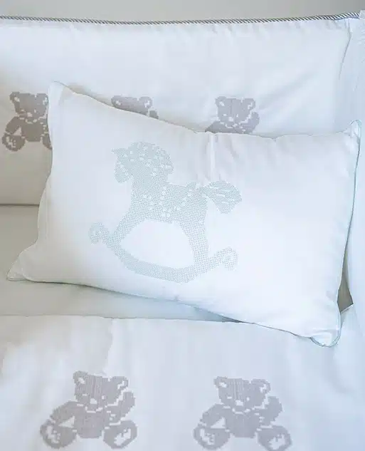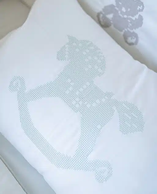 This embroidered rocking horse pillow will add a beautiful decorative touch to any nursery.