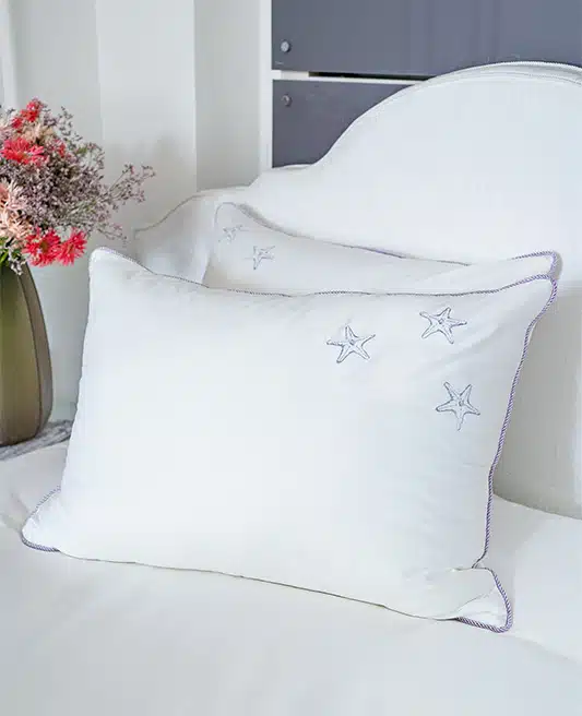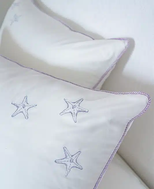 A refined decorative cushion crafted from crisp white cotton, featuring delicate starfish embroidery in a soft lilac tone.