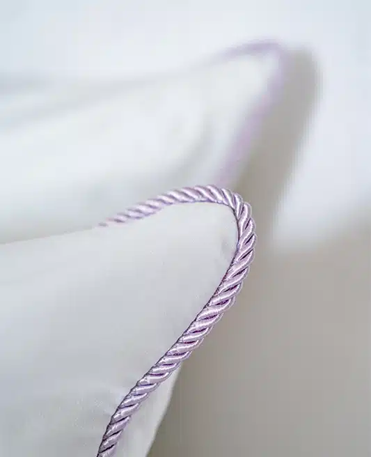 Placed subtly in the corner, the embroidery adds a quiet, coastal-inspired detail without overwhelming the design. The twisted lilac piping frames the cushion and brings a gentle contrast to the clean white base.