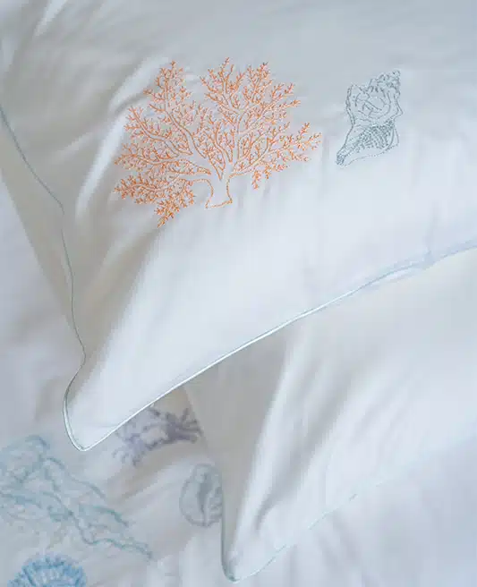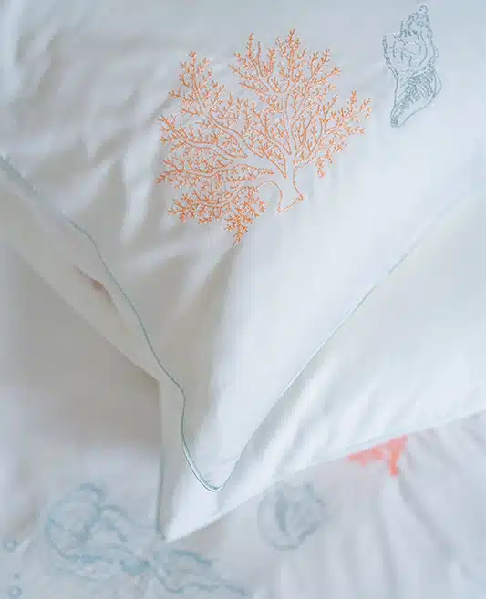 Exquisitely positioned in the lower corner, the embroidered coral in a serene apricot shade alongside a seashell in subtle aquamarine stands out against the pillowcase’s pristine white Egyptian cotton sateen background.