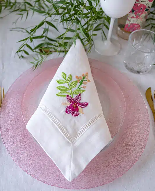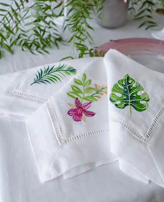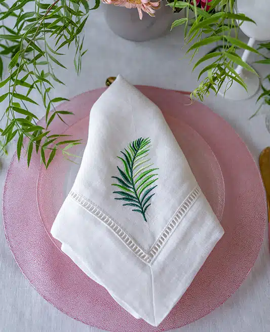 This image showcases a luxurious table napkin made from 100% linen, boasting a refined hemstitch finish along its edges. The napkin is adorned with a decorative, subtly perforated stripe that enhances its elegance. Embroidered with intricate tropical leaves, the design is specifically tailored to complement an Hermes plate set featuring similar tropical leaf patterns. The napkin’s sophisticated design makes it an ideal choice for an upscale dining setting.