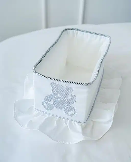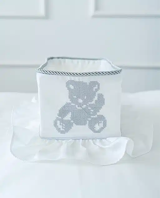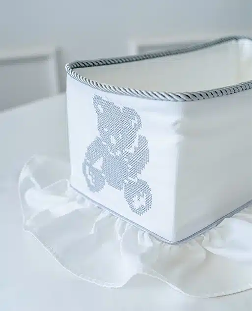 This royal soft embodied box is suitable for Nappies or any other storage use for your beloved your baby. Its easier to have your baby’s essentials next to you while changing a nappy and dressing up on a diaper chest. The “Teddy Bear” grey embroidery is one of White Spring’s signatures’ color, however for custom-made orders you could contact the store directly. Please bare in mind that the price might vary.